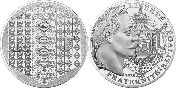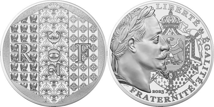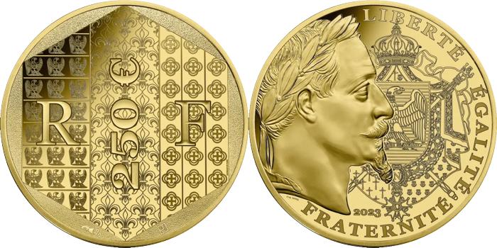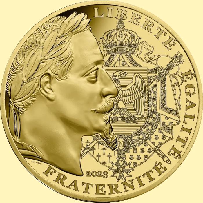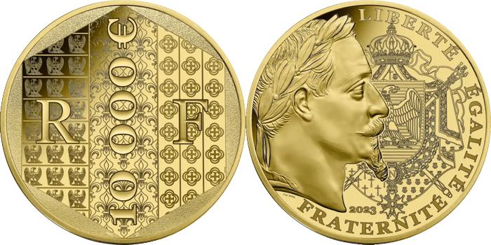 - Numismatique Française - Toutes ces monnaies ont été émises par la Monnaie de Paris et vendues, pour certaines, à un prix légèrement supérieur à leur valeur faciale. Elles ont cours normal uniquement sur le territoire français. 2- Les monnaies au type Ors de France - Année 2023 Réinterprétation du franc napoléonien gravé par Jean-Jacques BARRE, les monnaies de 2023 présentent un portrait laurée de l’empereur napoléon III. Son profil fut fortement inspiré par celui de son oncle Napoléon I, ayant lui-même construit son image en s’inspirant de l’empereur romain Jules César. À droite de son profil on retrouve les armoiries napoléoniennes.