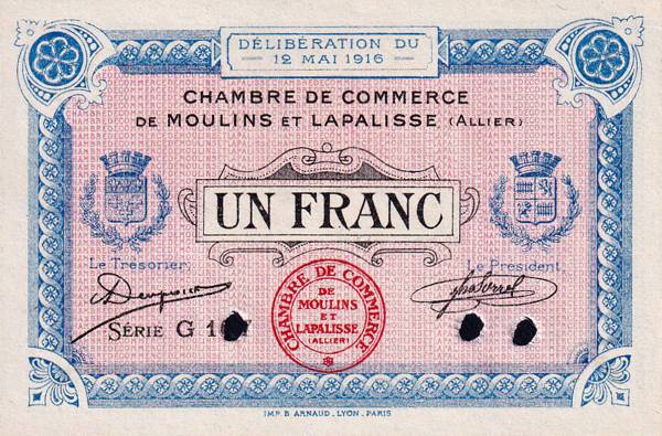 Chambre de Commerce de MOULINS et LAPALISSE Billet de 1 franc 2- Pirot 4a