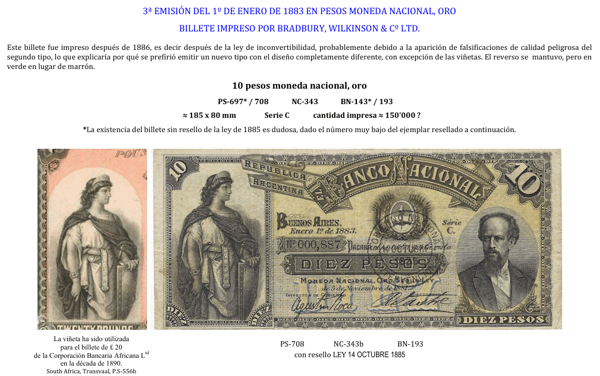 3 - 3a emisión del 1o de enero de 1883 en pesos moneda navional, oro - Billetes impresos por Bradbury, Wilkinson & CO LTD